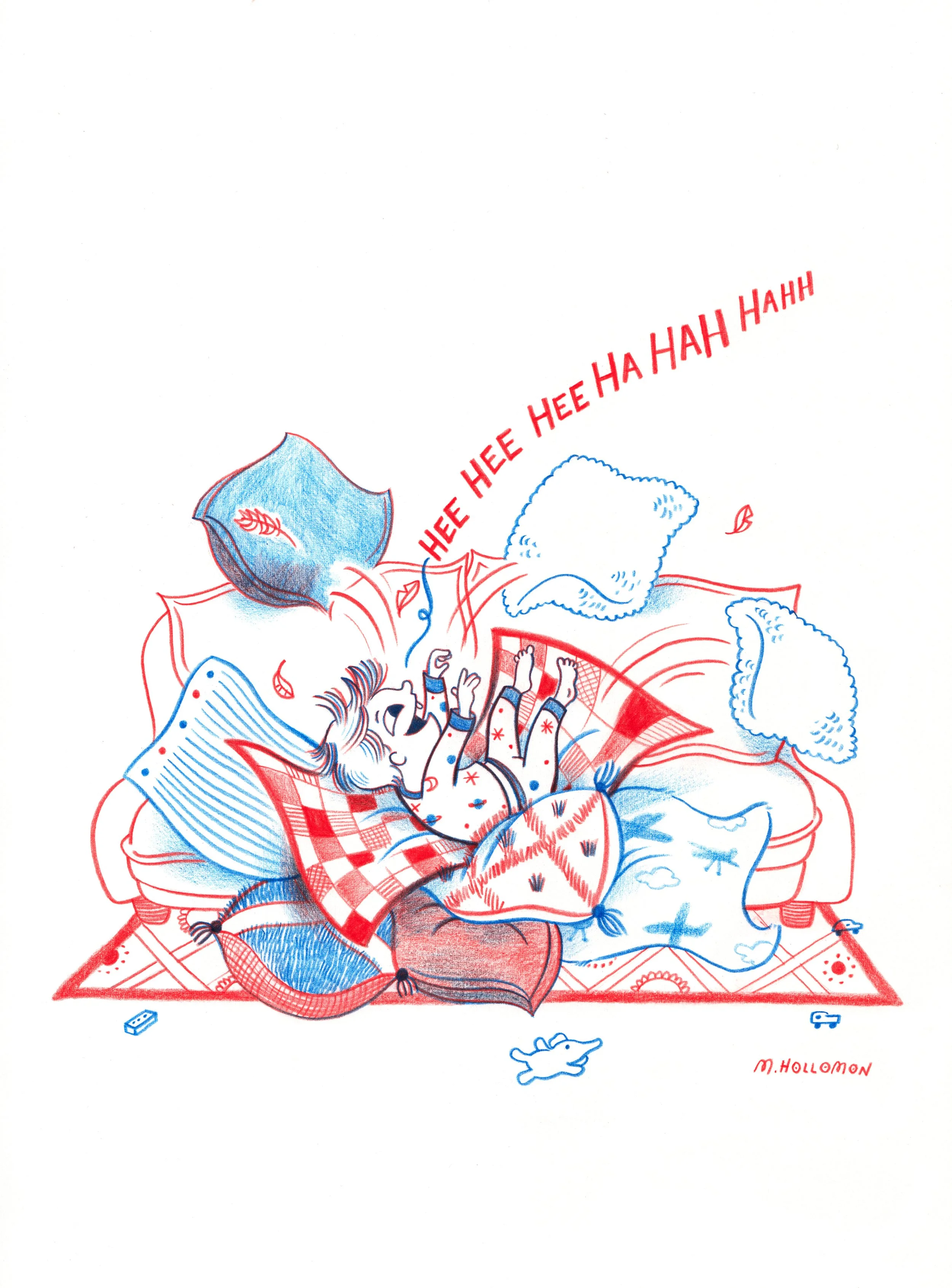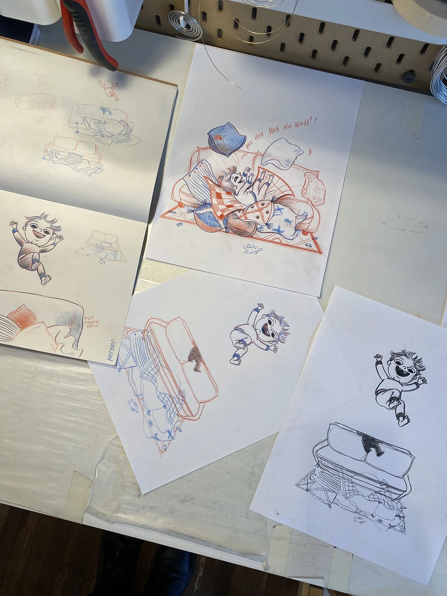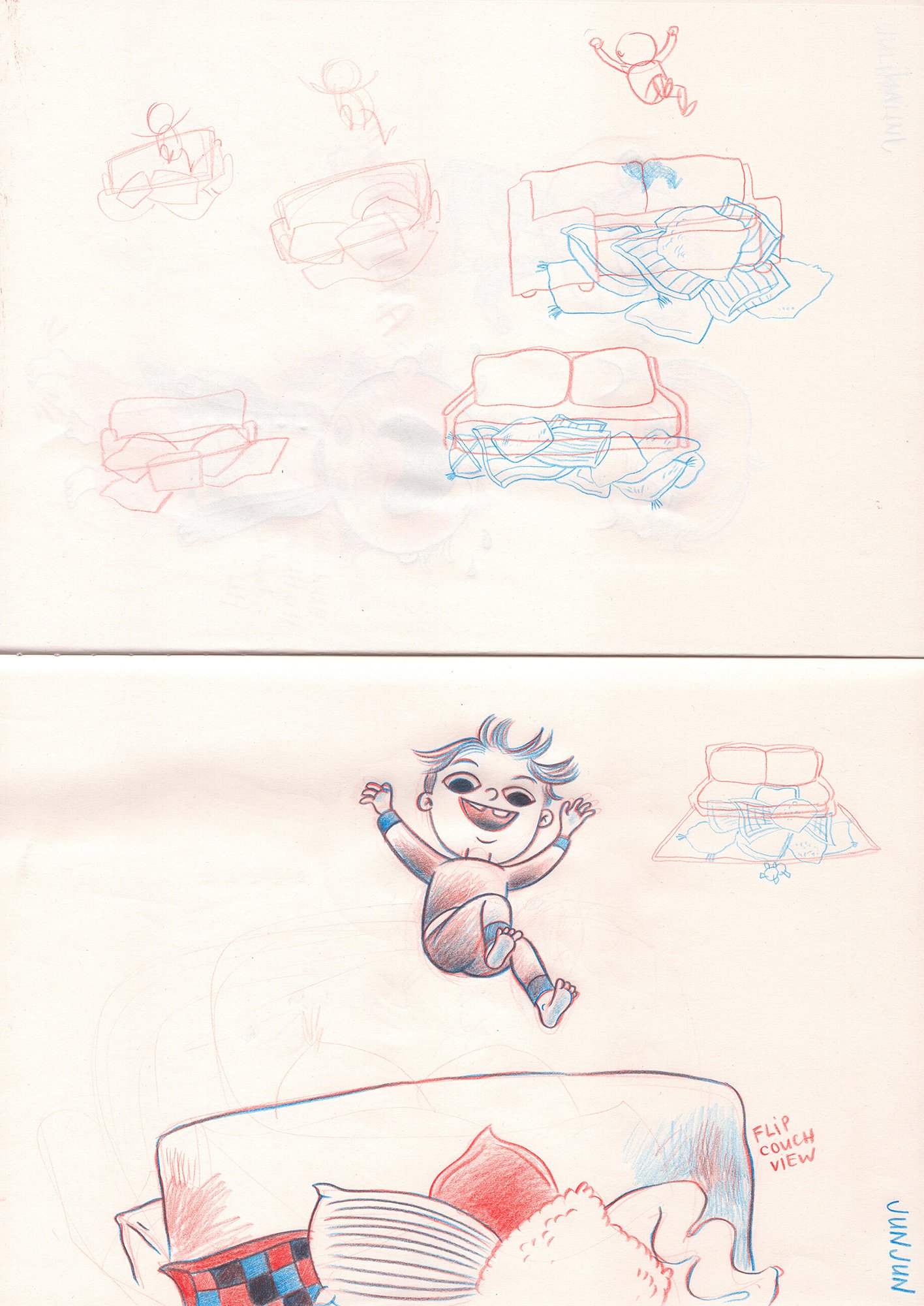 In the original incident, the boys had stacked their launching pad behind the couch. I decided to change that placement for the composition. I also split the moment into two: the Launch and the Landing.