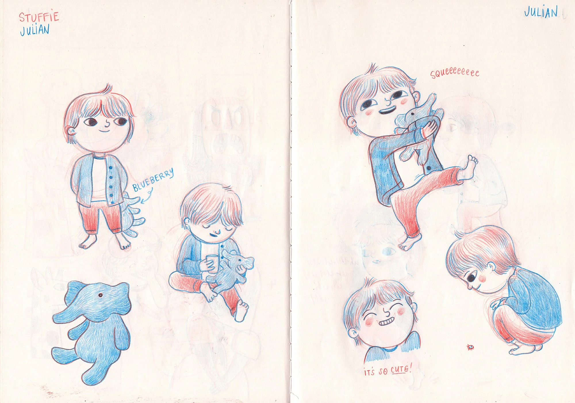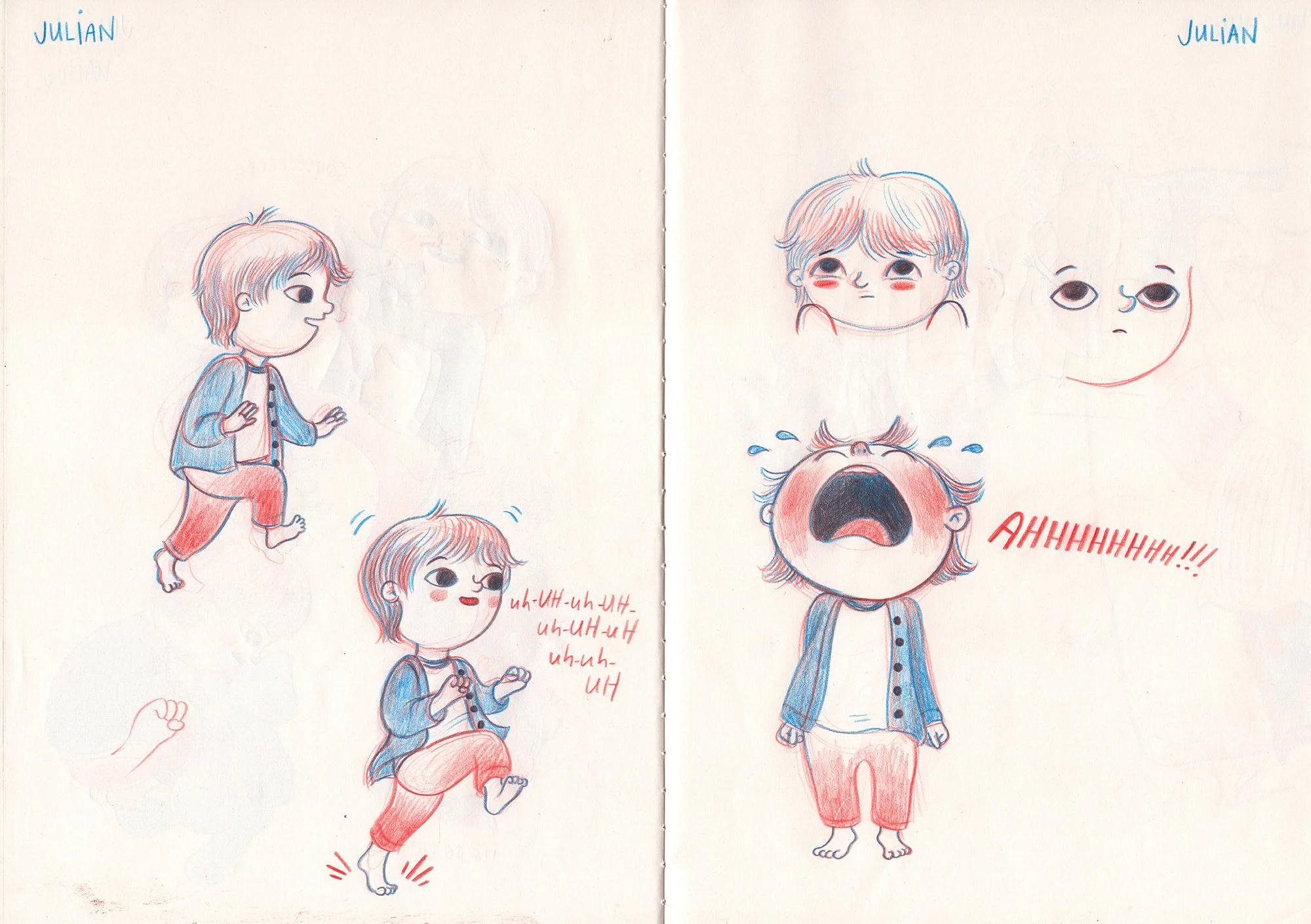 Later that evening I doodled in my sketchbook, which led to some finished panels. I had the image of a gravity-defying Jun stuck in my mind, but I also did some character explorations using Julian as reference.