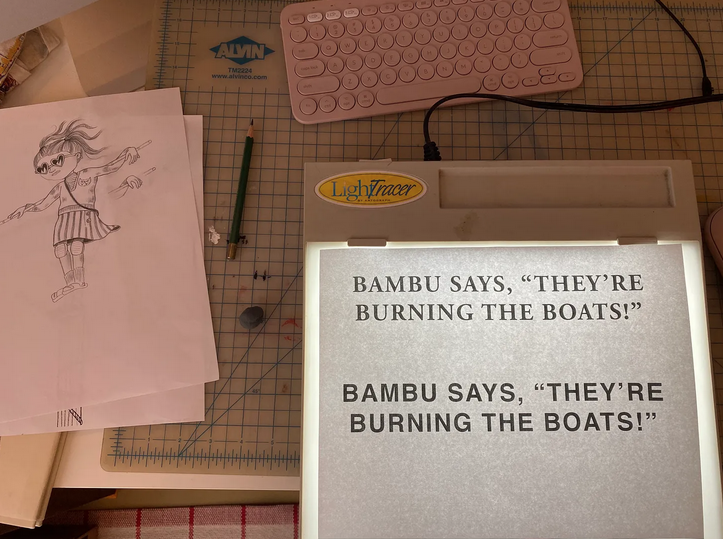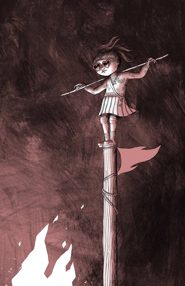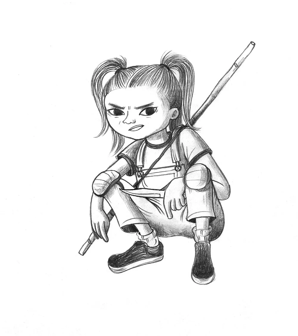 The character design was loosely based on Bambu’s own daughter, but she is also a depiction of how I (many of us?) are feeling these days (and have been for a long time?). Like, shit is fucked, I’m pissed, my knife is unsheathed and I’m ready to fight.