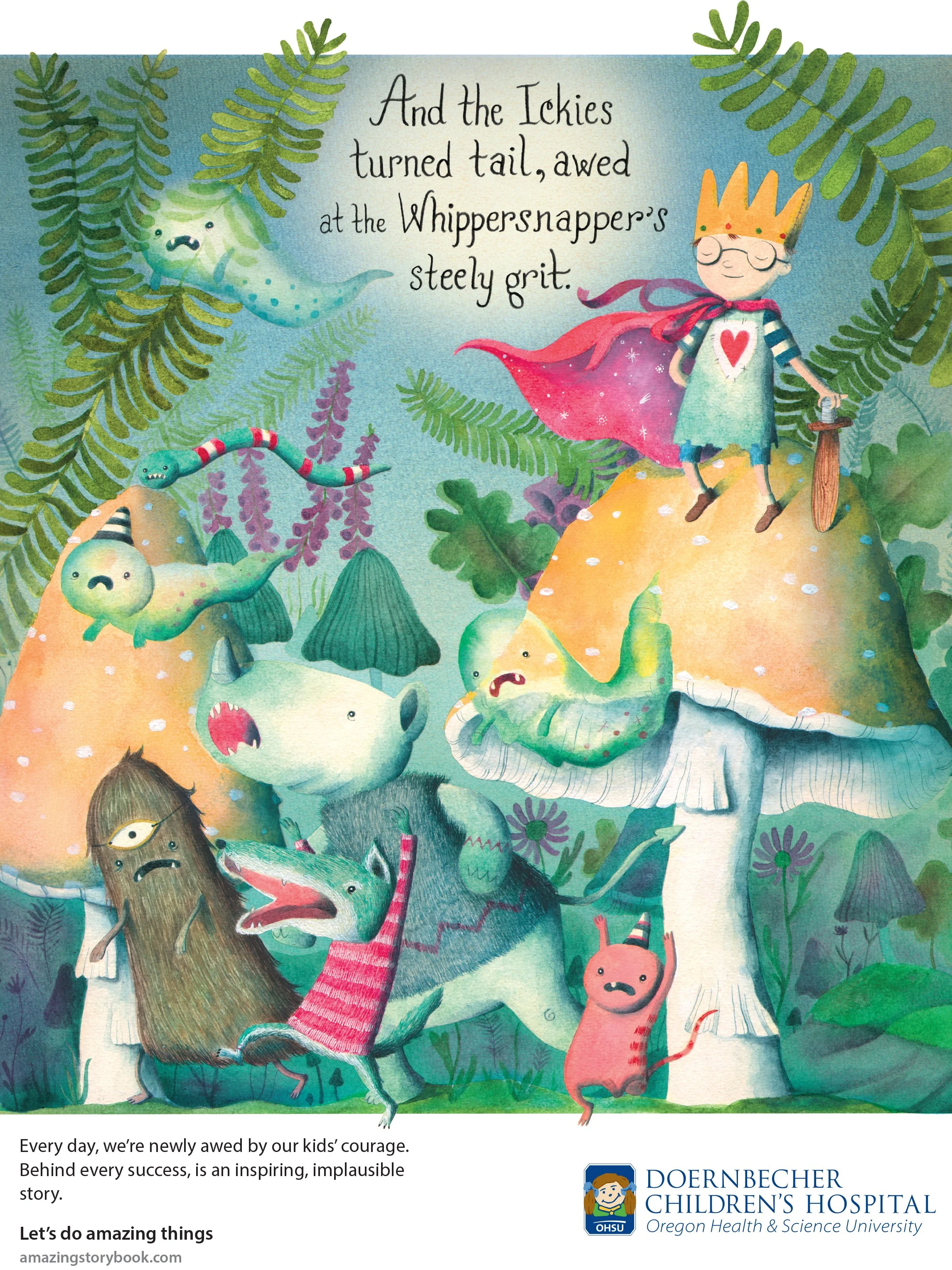 Illustrated advertisement commissioned by OHSU Doernbecher. The art for the ad was later adapted to a mural installed on site at the children’s hospital.