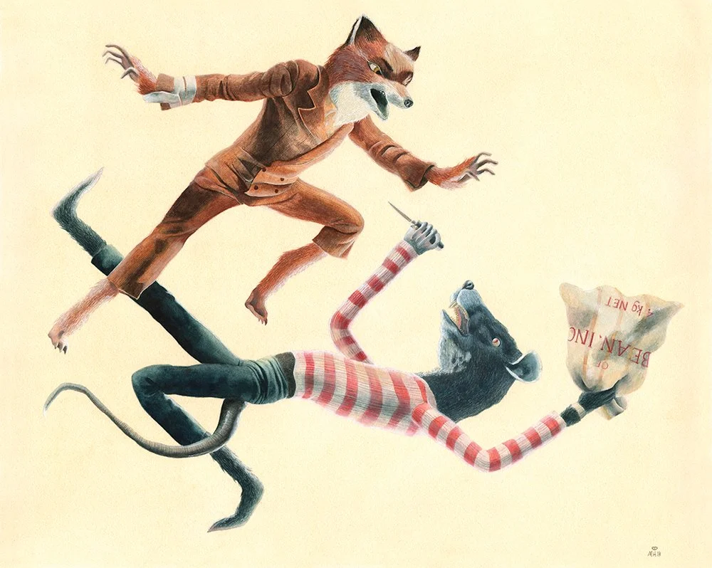 Spoke Art Gallery has hosted a number of Bad Dads exhibitions, inspired by the filmography of Wes Anderson. These works were created for Anderson’s Fantastic Mr. Fox.