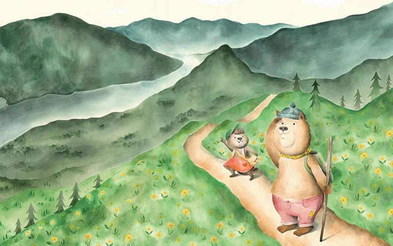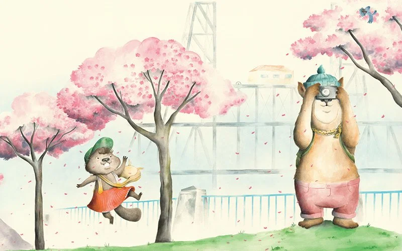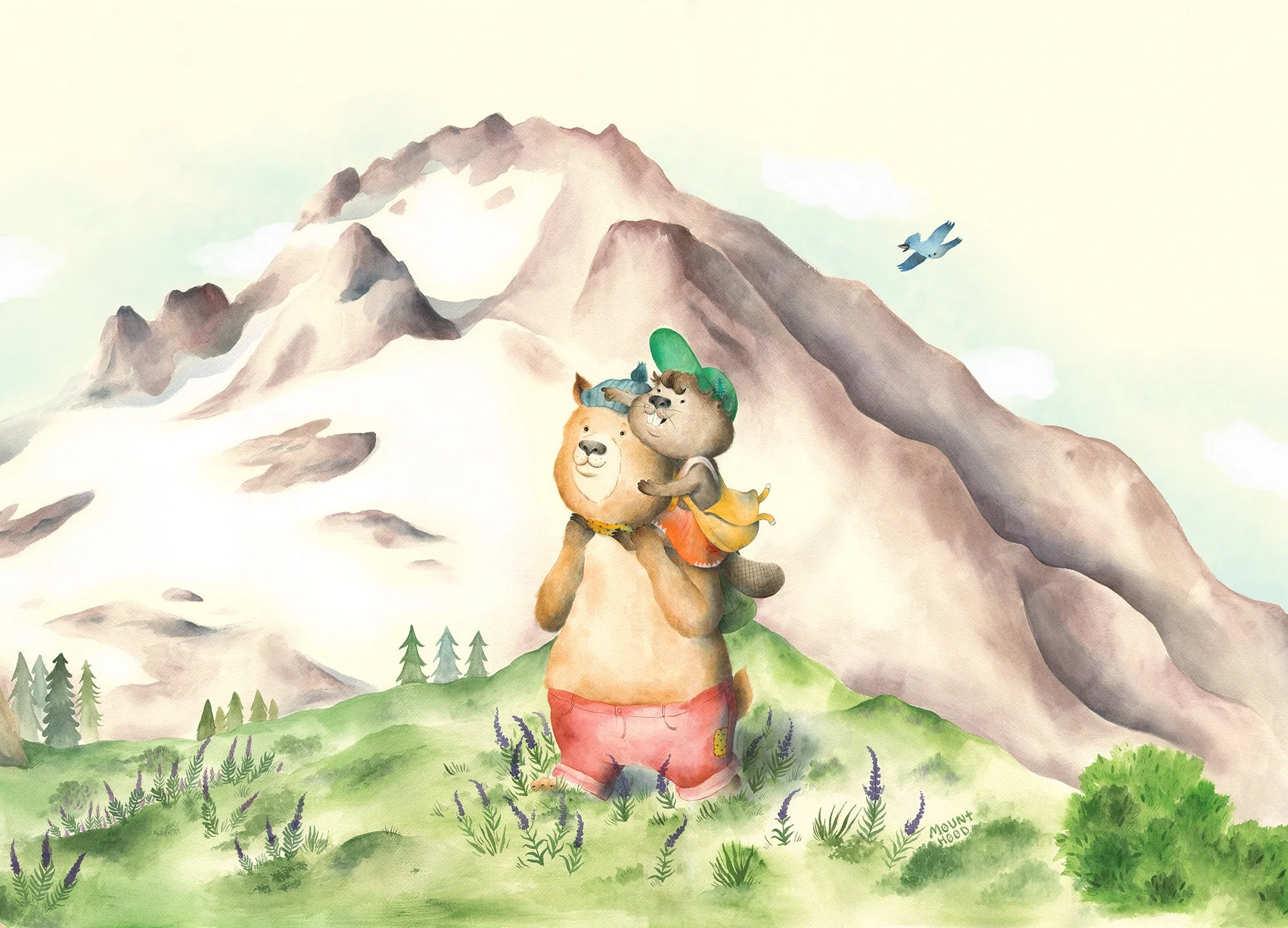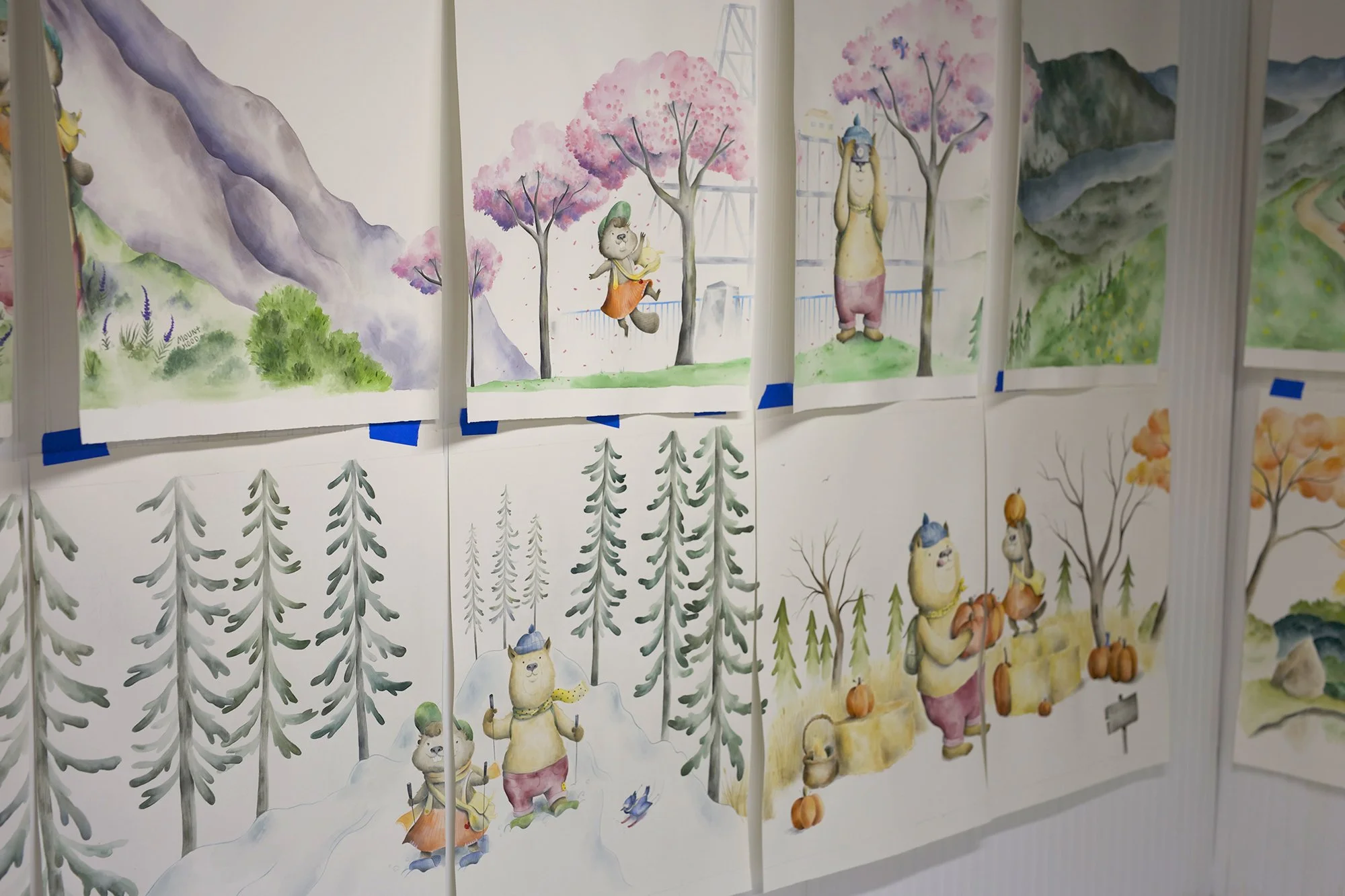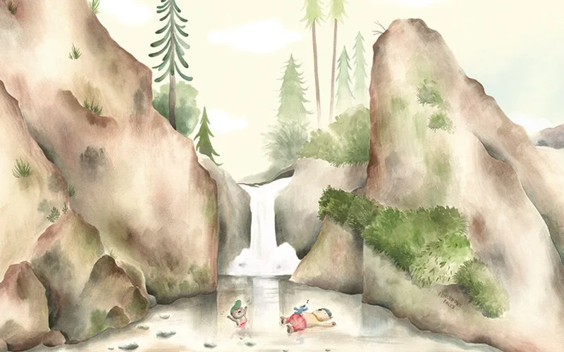I worked in collaboration with Sockeye Creative and SRG architecture firm to design and install this full-scale artwork in a newly constructed wing of the children’s hospital. I created Tiny and Toothy, two central characters whose narrative followed their adventures in some of the most well-known and beloved natural landmarks of Portland and the Columbia Gorge.