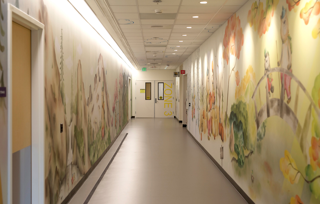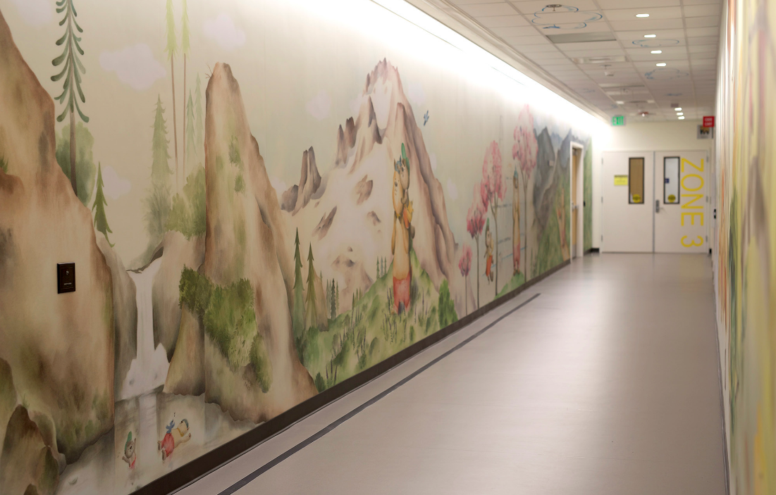 The installation include a long corridor, patient rooms, restrooms, glass doors, and ceiling tiles. All of the artwork was handpainted on watercolor paper, then scanned and printed onto large vinyl panels that were installed in the space.